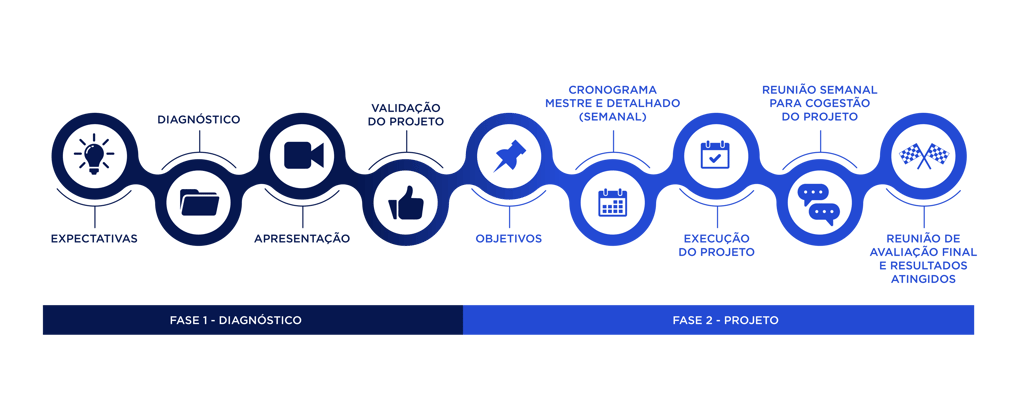 Através do Projeto proposto, elaborado na fase do Diagnóstico, a Consulting Now inicia a implementação com pleno envolvimento do cliente, que terá a oportunidade de acompanhá-lo em todas as suas fases, através de reuniões semanais de progresso.